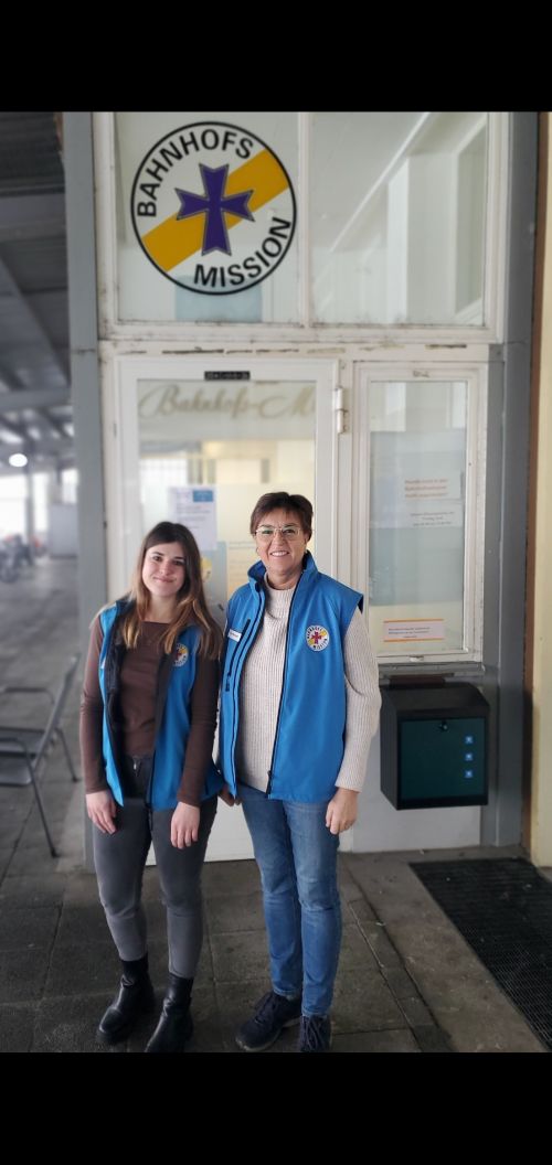 Zu erkennen sind sie an ihren leuchtend blauen Westen mit dem Logo der Bahnhofsmission.