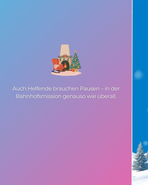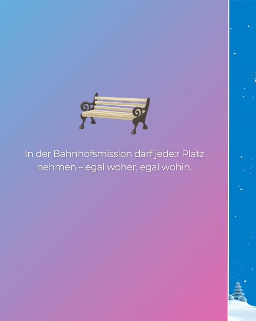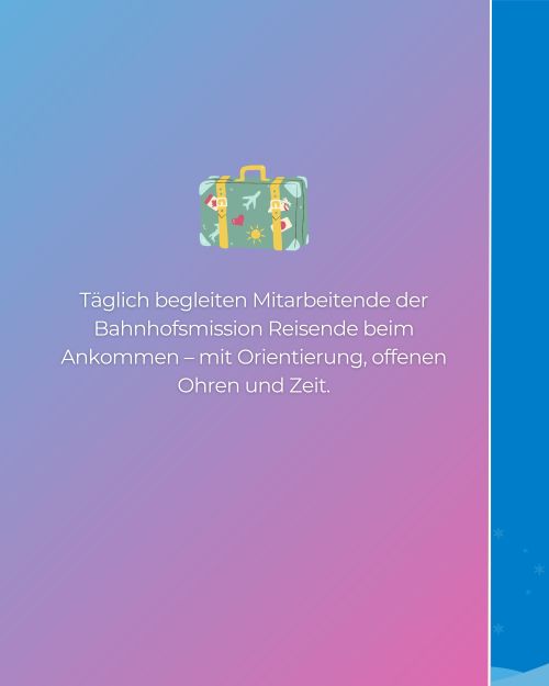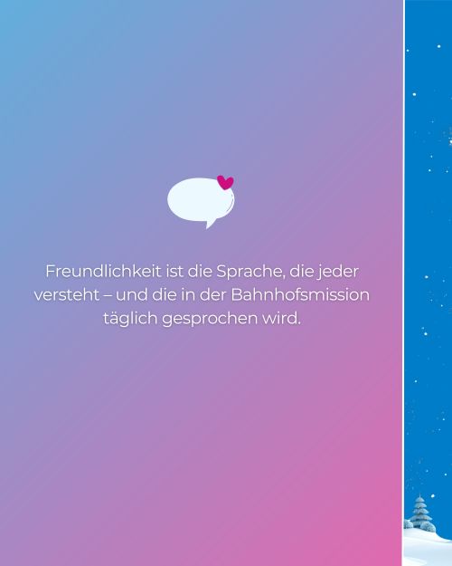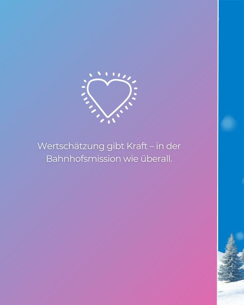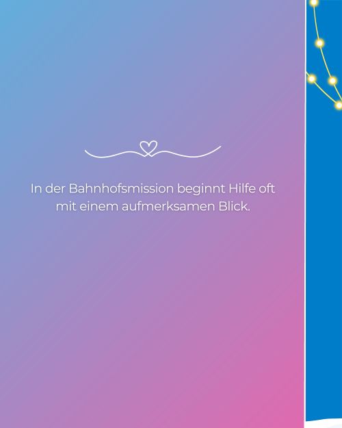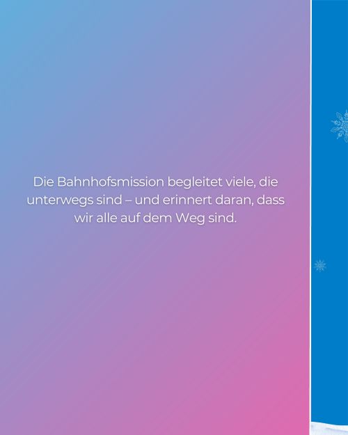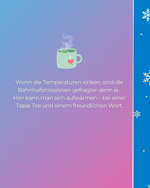Unter dem Motto „Wärme schenken“ erinnert unsere neue Infokampagne daran, wie wichtig die Bahnhofsmissionen gerade in der kalten Jahreszeit sind – für Reisende ebenso wie für Menschen in schwierigen Lebenslagen.
