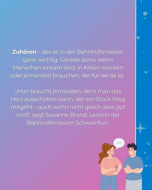 Außerdem freuen wir uns über ein Erklärvideo, das uns die Diakonie Bayern zur Verfügung gestellt hat. Es stellt die Geschichte, Hintergründe und Angebote der Bahnhofsmissionen vor und gibt einen tollen Einblick in die wichtige Arbeit, die ehrenamtliche Helfer:innen und Fachkräfte täglich leisten, um Menschen in Not zu unterstützen.