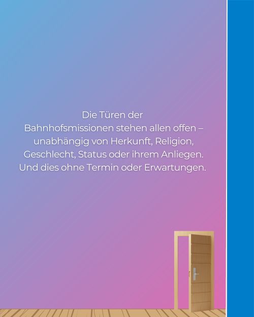 Wir finden: Auch heute lassen sich unsere Gäste von einem ganz besonderen "Stern" leiten – von unserem Logo und den Hinweisschildern der Bahnhofsmissionen. Wer ihnen folgt, findet an zwölf bayerischen Bahnhöfen einen geschützten Ort, offene Türen und ein offenes Ohr. Hilfe gibt es hier für Reisende wie auch Menschen in schwierigen Lebenslagen – unabhängig von Alter, Geschlecht, Religion oder Herkunft.